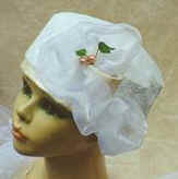 Haube aus Tüll und Seide mit Blüten